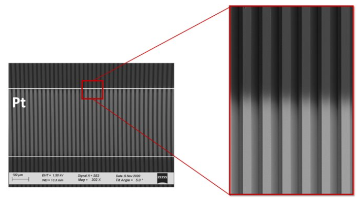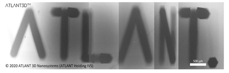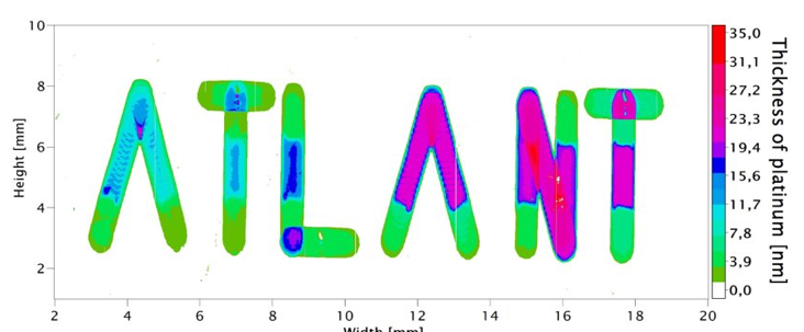 This concept has been proven to work now for more than a year and a half; by integrating this microreactor in a working prototype, the printing of lines of materials with varying thicknesses has been achieved with several materials, by adapting regular ALD processes to function with the microscale reactor. As an example, we can show here the patterned deposition of platinum on a thermal silicon oxide wafer. More specifically, the control of the thickness is visible on the thickness mapping of the ATLANT logo, as expected for an ALD process the thickness is dependent on the number of passes.